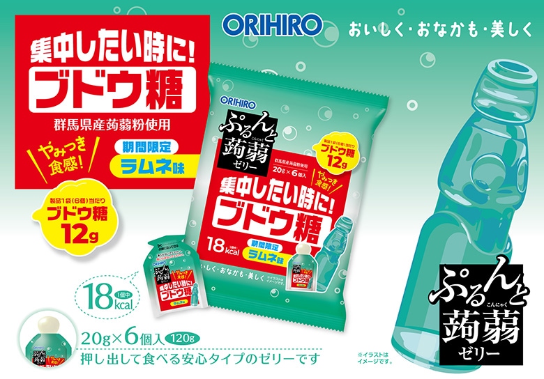 製品1袋(6個)当たりブドウ糖を12g配合。ラムネ感が美味しい手軽なプチサイズの蒟蒻ゼリーです。吸い込み防止形態で、どなたでもお手軽にお召し上がりいただけます。集中したい時におすすめです。小腹がすいた時の手軽なおやつとしてお召し上がりください。